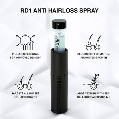 Một phương pháp điều trị tóc tiên tiến được bào chế một cách khoa học nhằm ngăn chặn sự hình thành DHT, cải thiện khả năng neo giữ của chân tóc và bổ sung dinh dưỡng cho tóc và da đầu, giảm đáng kể tình trạng rụng tóc và tối đa hóa sự phát triển của những sợi tóc. Được đóng gói với các thành phần dưỡng chất tiên tiến và đắt tiền nhất trên thế giới hiện nay, giúp tác động và kích thích sâu vào tất cả bốn giai đoạn phát triển của sợi tóc. Công thức này giúp tăng độ phồng và sóng cho tóc để tăng độ bồng bềnh và giảm tình trạng xơ rối, vì vậy bạn hoàn toàn có thể sử dụng RD1 như 1 sản phẩm Prestyling (xịt hỗ trợ tạo kiểu tóc), bên cạnh công dụng dưỡng của nó.
