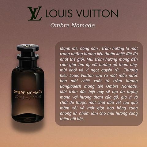Được thiết kế dành cho những người yêu thích thứ quí hiếm, Ombre Nomade tập trung vào những cảm giác vô hạn về những thành phần huyền thoại nhất của nước hoa, gỗ Trầm hương. Một chất liệu nổi loạn, mà đẹp đầy ma mị, nhà chế tạo nước hoa bậc thầy Jacques Cavallier đã hòa vào một chút benzoin và điểm nhấn là hương quả mâm xôi. Xa xa, một làn khói hương mong manh bay về phía chân trời, chưa bao giờ mùi gỗ Trầm hương lại ma mị và thần bí tới vậy.