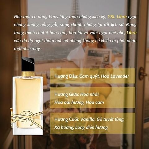 Libre của hãng Yves Saint Laurent là dòng nước hoa nữ được ra mắt vào năm 2019 bởi sự bắt hay hợp tác giữa chai chuyên gia nước hoa Anne Flipo và Carlos Benaim.  Thiết kế của Libre gây ấn tượng mạnh mẽ về tính độc đáo, sang trọng và tinh tế mà hãng Yves Saint Laurent vẫn thường ưu ái dành cho các bộ sưu tập thời trang danh tiếng của mình. Libre là một mùi hương hoa Phương Đông, nổi bật với nhóm hương chính như Hoa lavender quyến rũ và Hoa cam tươi mát, thảo mộc. Sự góp mặt của Vani giúp cô nàng Libre trở nên ngọt ngào và quyến rũ hơn, nhưng vẫn giữ được độ thanh lịch và tươi mới khi Note hương cam vẫn hiện hữu. Sự sang trọng, gợi cảm và cá tính là điều hãng Yves Saint Laurent muốn gửi gắm đến cô nàng kiêu kỳ này.
