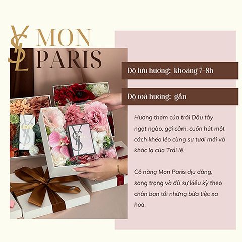 Mon Paris, đúng với tình yêu mãnh liệt của YSL, thậm chí còn nồng nàn hơn, hoa mỹ hơn, nhiều nét Paris hơn. Một loại nước hoa được đặt theo tên nàng thơ của ngài, một niềm đam mê, tuyên bố tình yêu, giống như hét lên thật to “JE T’AIME” từ đỉnh tòa tháp Eiffel vậy.